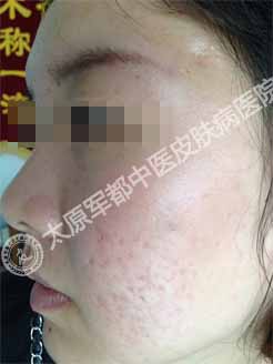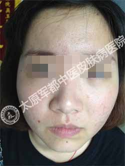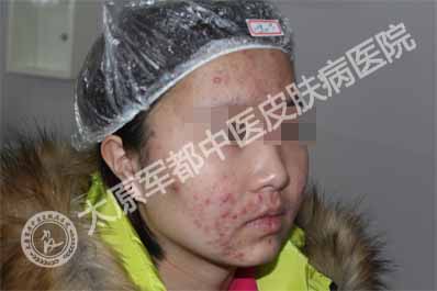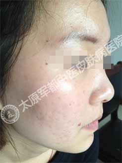 太原肤康皮肤病医院首席祛痘医生接诊了该患者,诊断为粉刺脓疱型痤疮。因脸上这样的惨状,她很不自信,经常把自己关在房间里,同学聚会也不参加……从这个女生的诉说中,主任还得知了她此前在别处求医后治疗无效的无奈。