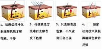目前市场上许多美容院打出“激光法、磨削法、冷冻疗法、化学剥脱法、光子疗法”等所谓具有高科技含量的治疗,没有铲除顽固性色素的内在因素,这种治标不治本的方法不仅不能祛除,还有易留疤、易反复、治疗费用高等弊端。